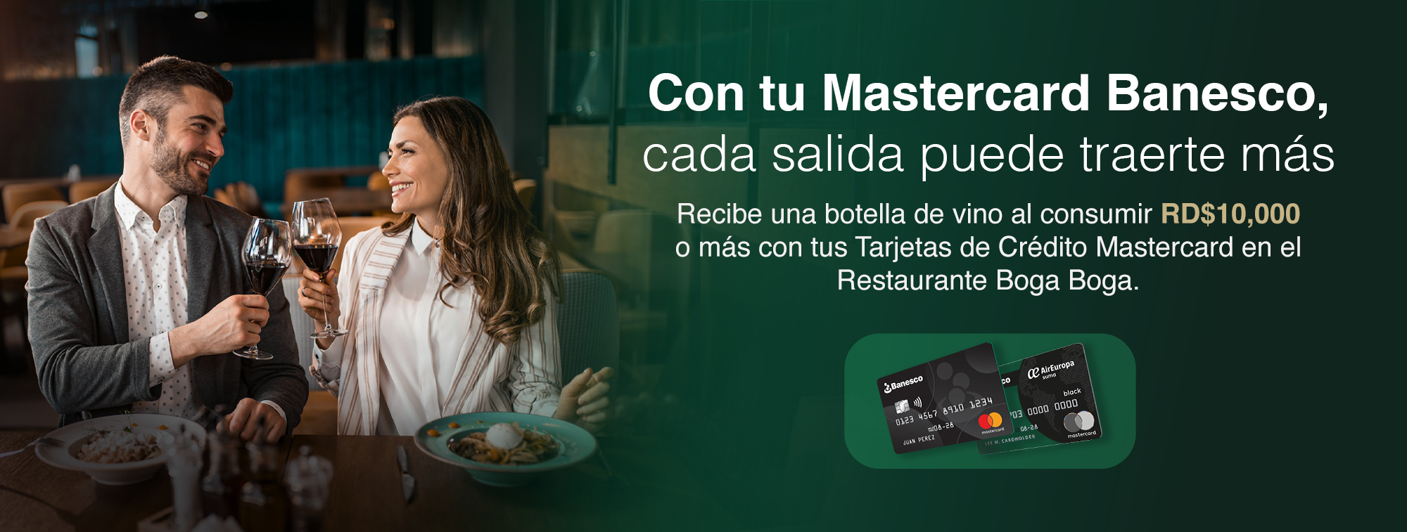 Al consumir con sus Tarjetas de Crédito Mastercard Black Air Europa Banesco, o Mastercard Black Banesco, en el restaurante Boga Boga, reciben una botella de vino.